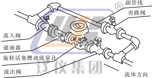 該流量計必須與濾油器配套使用而用水平安裝(即表盤在水平位置),安裝時要注意流體流向,應(yīng)符合流量計主體上的箭頭所示方向。為了使工藝設(shè)備不停止運轉(zhuǎn)即可檢修流量計與清洗濾油器,應(yīng)裝設(shè)副管線,可參照下面的安裝示意圖。